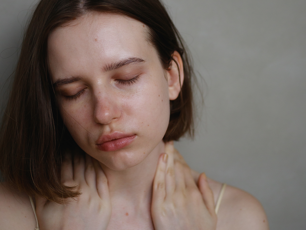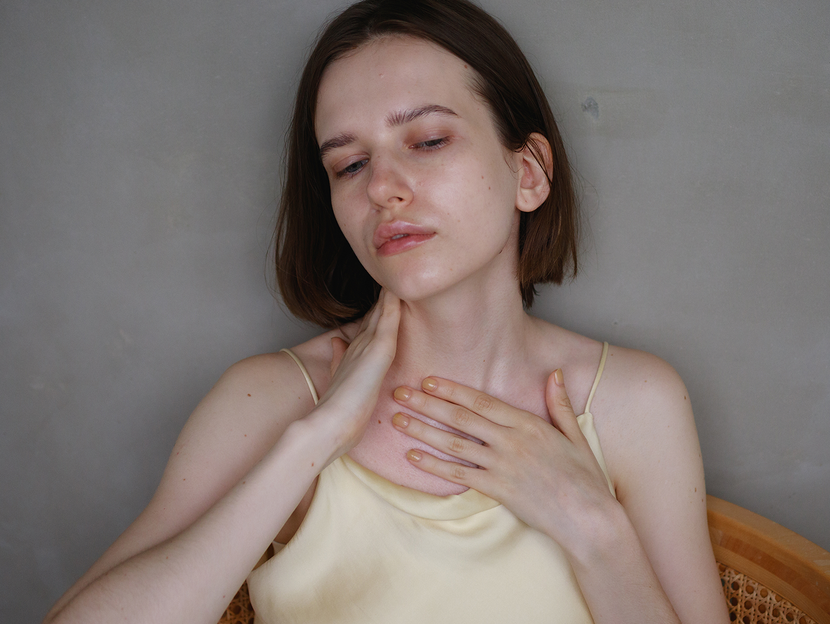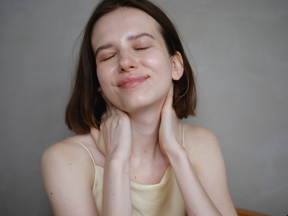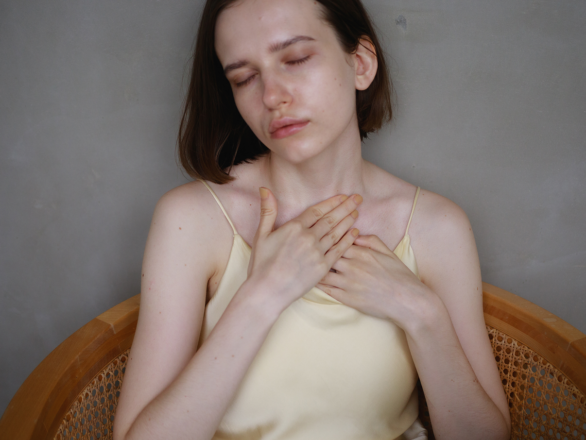 左手を右側の鎖骨の上に置き、胸の中心から肩の付け根に向かってゆっくりとすべらせます。数回繰り返してから、左側も同じように行います。